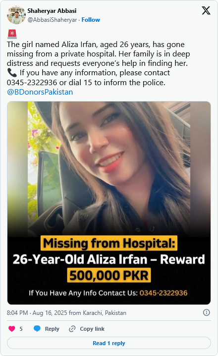 Who is Aliza Irfan? Mystery Behind Young Woman Disappearance From Karachi’s Private Hospital