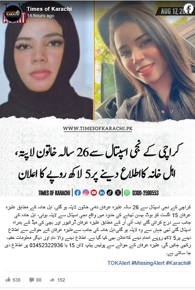 KARACHI: A 26-year-old woman, identified as Aliza Irfan, has gone missing from a private hospital in Karachi.