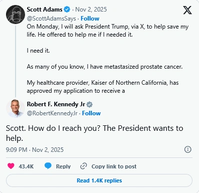 Following Adams’ appeal, several notable figures responded alongside President Trump. Secretary of Health and Human Services Robert F. Kennedy commented, “Scott. How do I reach you? The President wants to help.”