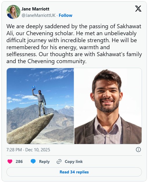 In a tweet expressing condolences, British High Commissioner Jane Marriott stated: “We are deeply saddened by the passing of Sakhawat Ali, our Chevening scholar.”