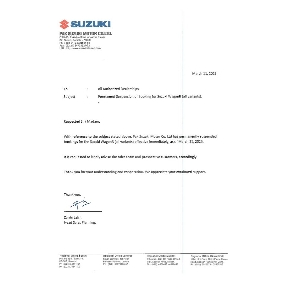 A notification dated for March 11, confirmed the development directing all authorized dealers across Pakistan to suspend bookings of WagonR.