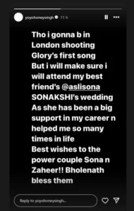 On the other hand, Bollywood rapper Yoyo Honey Singh has also confirmed the marriage of Sonakshi. Honey Singh shared the story on Instagram which read, ‘I will be in London to shoot the first song of my new album but will make sure to attend my best friend Sonakshi’s wedding.’