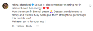 Popular Bollywood singer Rekha Bhardwaj also commented on Mehreen Jabbar’s post and expressed grief over Haniya’s death.