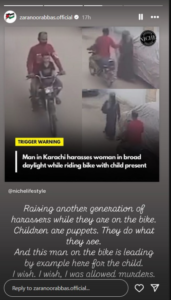 The actress shared the video of the incident on her Instagram story and wrote in the caption: “Another generation of motorcycle harassers is being raised.”
