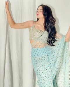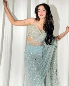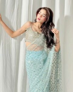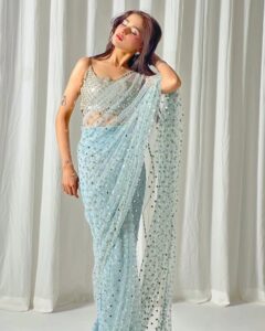 Draped in an ethereal light blue and silver saree adorned with intricate mirror work, Aima effortlessly embodied festive glamour.