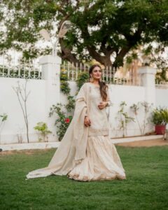 Hiba Bukhari looked ethereal in a cream-colored traditional outfit adorned with delicate embroidery, perfectly complemented by statement jewelry and a soft glam makeup look. Arez Ahmed matched her grace in a regal beige sherwani, adding to the couple’s timeless charm.