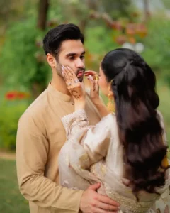 For the occasion, Mawra and Ameer twinned in elegant pastel outfits. Mawra looked radiant with beautifully adorned mehendi on her hands, complemented by traditional jewelry, adding to her graceful look.
