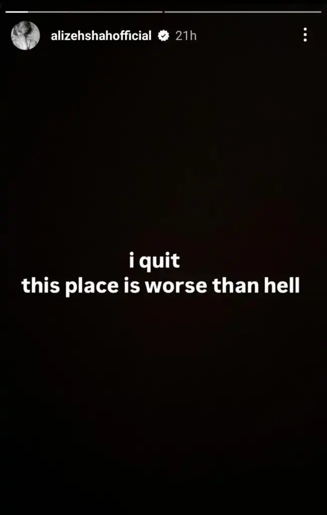 Alizeh Shah shared that she’s been unfairly judged throughout her career, stating, “I have never done anything immoral to get roles,” yet continues to face relentless scrutiny. Frustrated by the constant attacks, she made a bold decision to step away from social media. In a raw Instagram story, she posted, “I Quit,” calling the online space a “hell” and deleting all her previous posts.