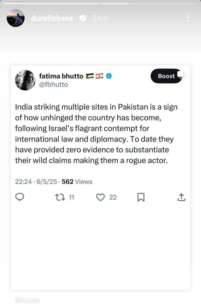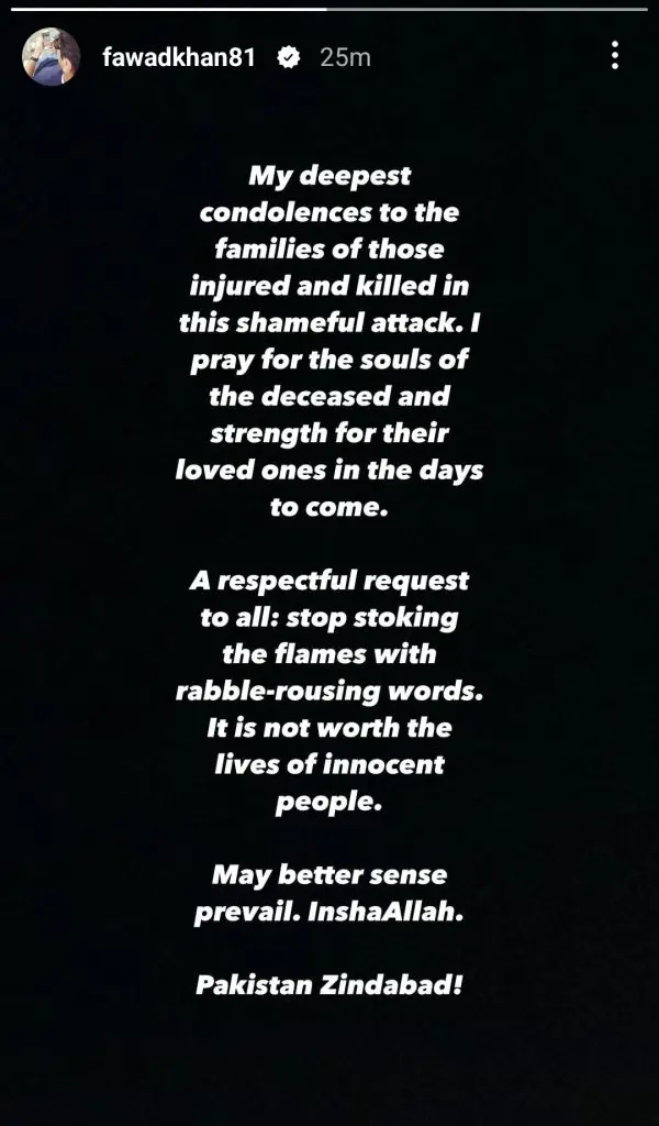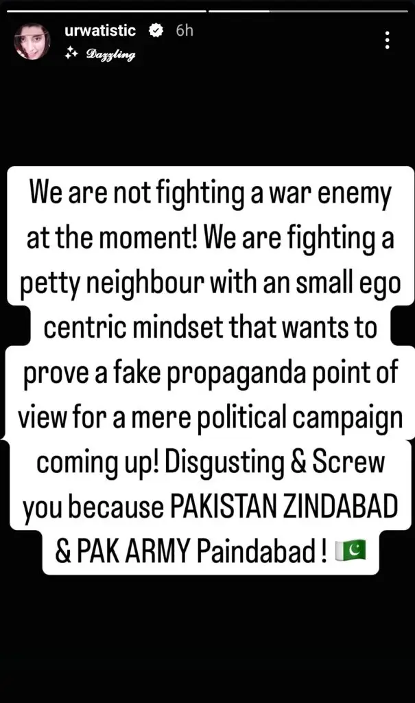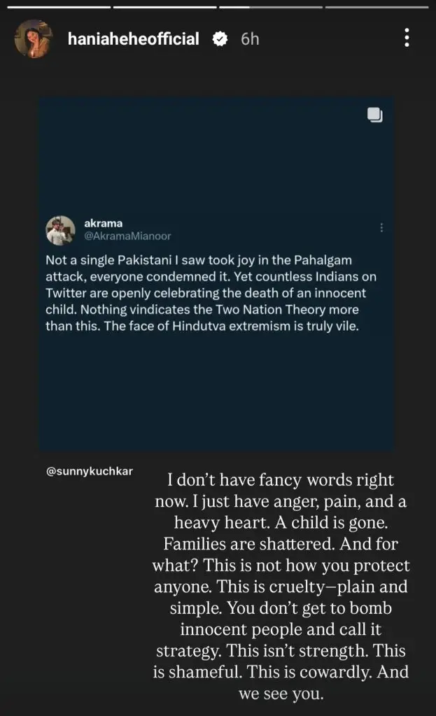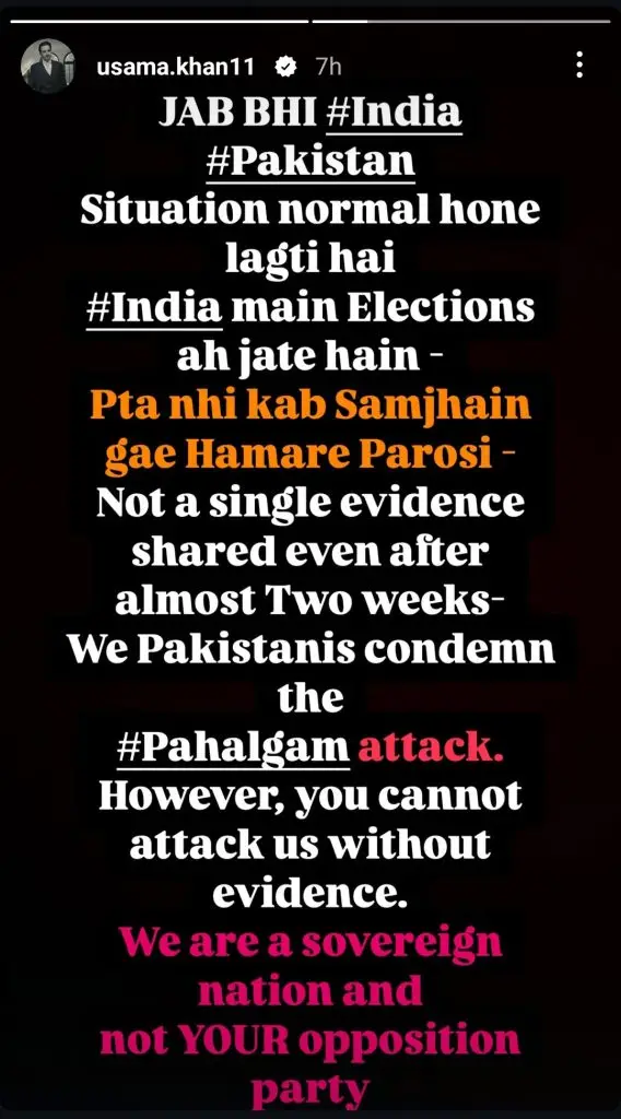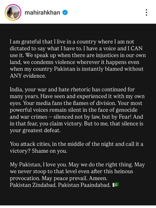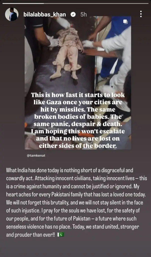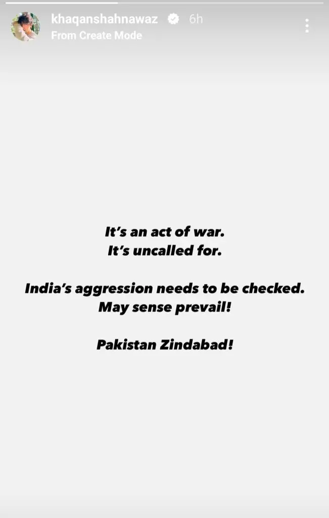 Amid the rising tensions, prominent Pakistani celebrities have taken to social media to express their patriotism and condemn the aggression. Stars like Muneeb Butt, Fawad Khan, Hania Aamir, Urwa Hocane, and Bilal Abbas Khan have shared heartfelt messages. While Fawad and Hania emphasized the need for peace and de-escalation, others, including Muneeb and Bilal, delivered strong criticisms of India’s actions.