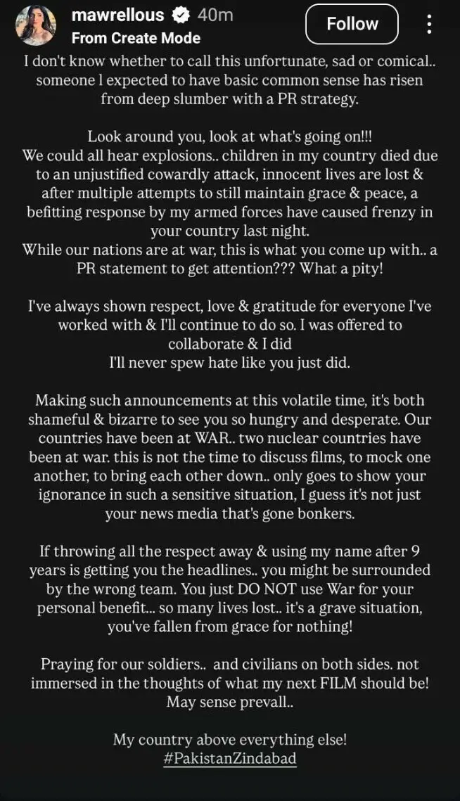 Addressing Rane’s comments in the context of ongoing tensions between the two countries, Hocane said, “Making such announcements at this volatile time, it’s both shameful and bizarre to see you so hungry and desperate. Our countries have been at WAR… two nuclear countries have been at war, this is not the time to discuss films, to mock one another, to bring each other down. Only goes to show your ignorance in such a sensitive situation, I guess it’s not just your news media that’s gone bonkers.”