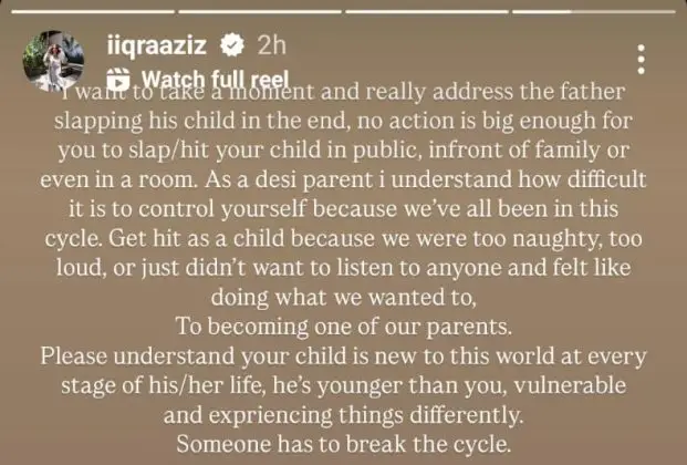 Iqra Aziz, known for her strong parenting values and commitment to raising her son Kabir Hussain with compassion, shared the video on her Instagram story. In her message, she acknowledged that “as a desi parent she understands that we can have an urge to slap our child for being too loud or too naughty as we have seen that happen way too often. But we need to break this cycle and no amount of action warrants a physical slap to a child.”