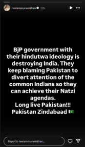 In her post, Neelam said, βThe BJP government is killing India with its Hindutva ideology. They keep accusing Pakistan to deflect the Indian public and to pursue their Nazi-led objectives.β