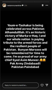 Concluding her statement, Neelam expressed appreciation for Pakistanβs military leadership, particularly Chief of Army Staff General Syed Asim Munir. βI, along with the whole nation, salute our gallant armed forces and the valiant people of Pakistan. βBunyan Marsusβ will never be forgotten. I am proud of our Chief, General Syed Asim Munir,β she stated.