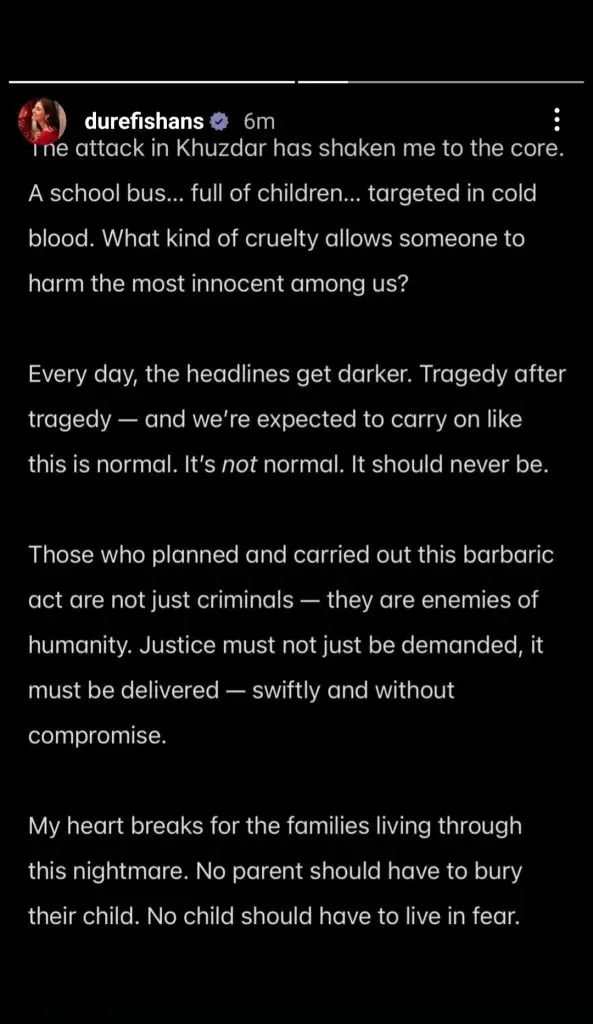 Durefishan Saleem expressed her grief, saying, “The attack in Khuzdar has shaken me to the core. A school bus full of children was targeted in cold blood. What kind of cruelty allows someone to harm the most innocent among us? Every day, the headlines get darker. Tragedy after tragedy, and we’re expected to carry on like this is normal. It’s not normal. It should never be.”