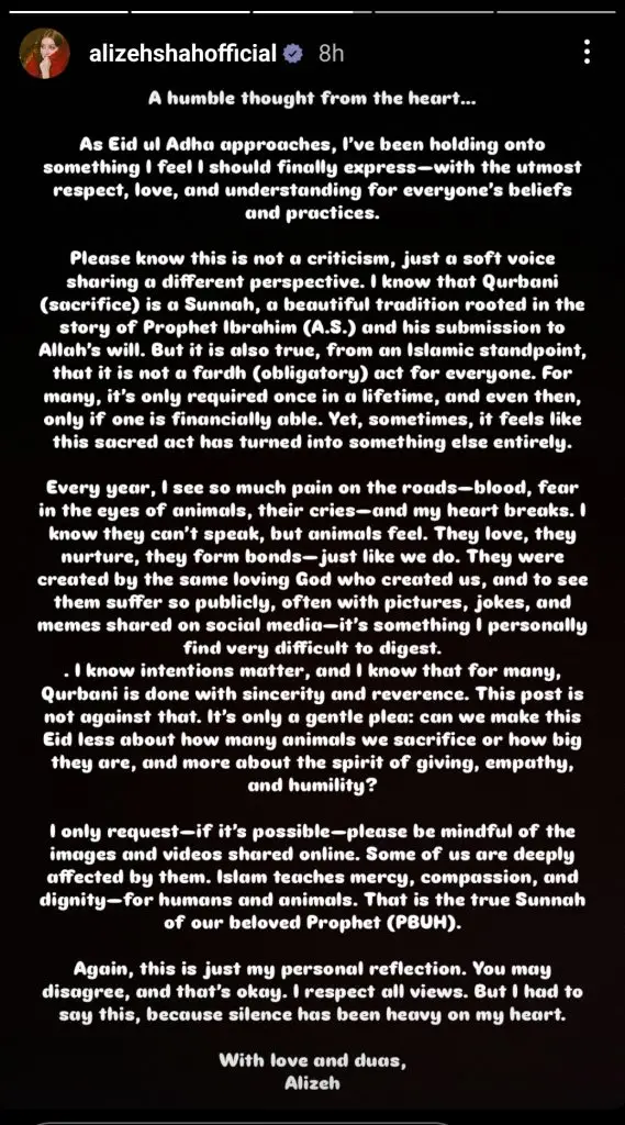 With over 4.3 million followers on Instagram, Alizeh used her platform to express discomfort with how animal sacrifice is publicly conducted and portrayed. In a sincere and respectful tone, she clarified, “Please know this is not a criticism, just a soft voice sharing a different perspective.”