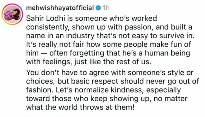 Pakistani actress Mehwish Hayat has voiced her disapproval on social media regarding viral videos in which fellow actors are seen imitating host and actor Sahir Lodhi.