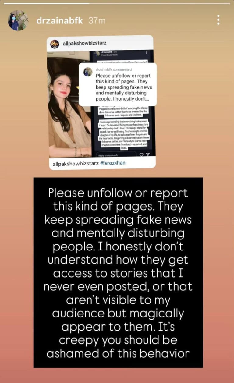 However, Zainab Feroze has since denied the claims. She took to her social media to call the post fake, stating that it was a disturbance to her mental peace. She also urged her followers to report the page responsible for spreading the false story.