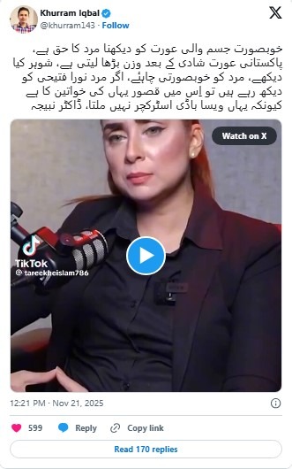 She argued that if men are attracted to physically appealing women, it is their “right” and controversially blamed Pakistani wives for their husbands’ wandering eyes. Dr. Nabiha claimed that “many Pakistani women gain weight after marriage, leading to a lack of physical attraction for their husbands” and asserted, “A woman is created for beauty. If she doesn’t make her body beautiful, then she is completely ruined.”