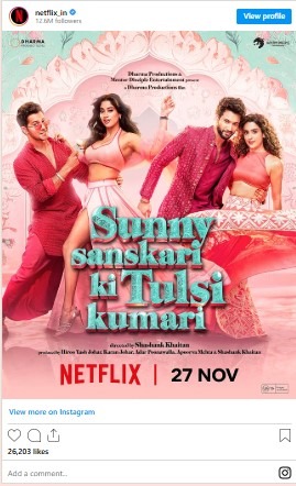 On Wednesday, Sony Music announced that Sunny Sanskari Ki Tulsi Kumari will begin streaming on Netflix starting November 27. Sharing a poster featuring the film’s lead cast, the team revealed, “Muhurat nikal gaya guys. Watch Sunny Sanskari Ki Tulsi Kumari, out 27 November, on Netflix. #SSKTKOnNetflix.”