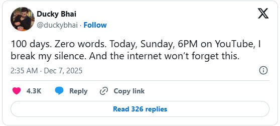 Ducky Bhai Break 100-Day Silence with Big Announcement, 6PM on YouTube, I break my silence