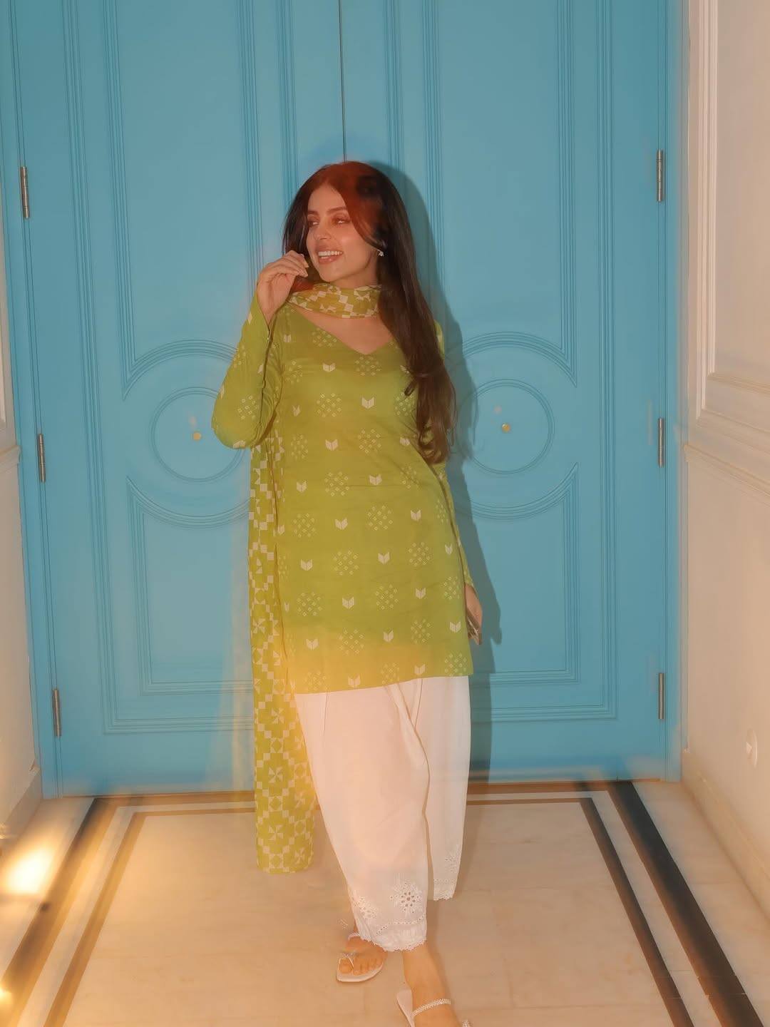 In the newly shared pictures, a guest at the celebration can be seen wearing a refreshing light green traditional outfit, paired with a matching patterned dupatta and crisp white trousers. The soft makeup and sleek hairstyle add effortless elegance to the look, making it a perfect blend of traditional charm and modern simplicity. The bright blue backdrop in some of the pictures enhances the overall aesthetic, giving the photos a vibrant, eye-catching appeal.