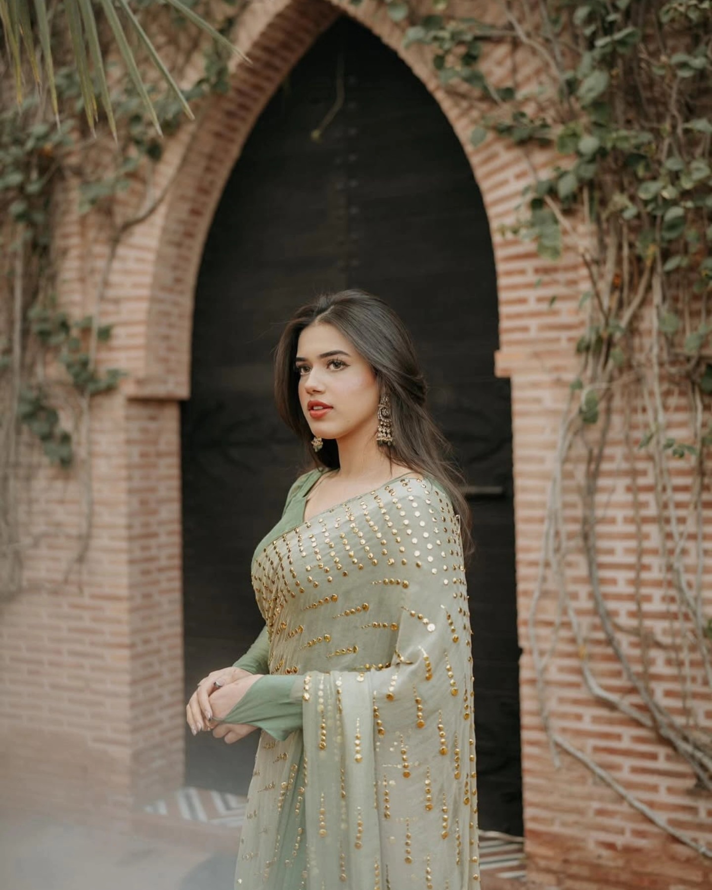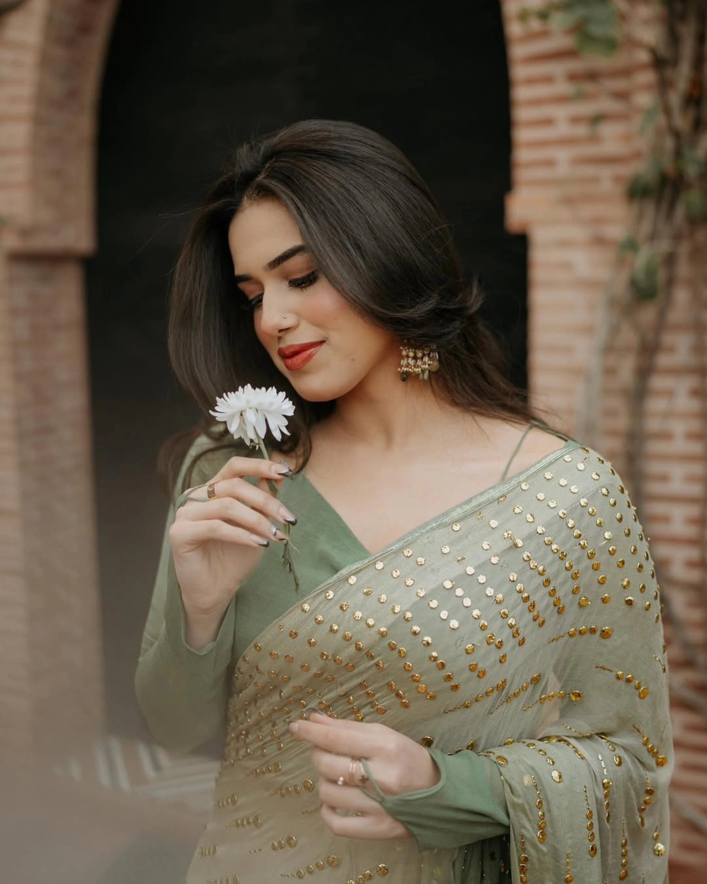 Alina Amir, popular for her TikTok presence, captured attention at Haris Ali’s wedding with her elegant appearance. The social media sensation opted for a beautiful green saree adorned with intricate gold embellishments, exuding grace and poise. The choice of attire was complemented by her stylish accessories, including gold earrings and a chic hairstyle, making her one of the most talked-about guests at the event.