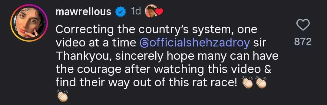Mawra Hocane said he was “correcting the country’s system, one video at a time”. She hoped people could gather the courage to “find their way out of this rat race” after watching the video.