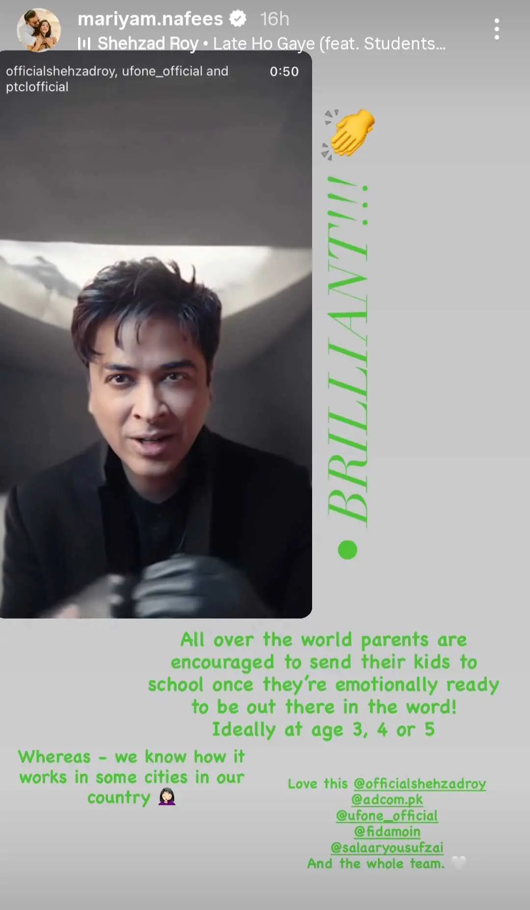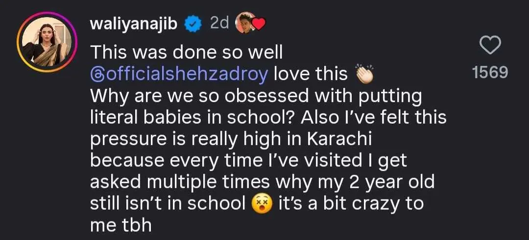 Maryam Nafees also posted on her Instagram story the highlight the comparison of our Pakistan education system to the rest of the world. She said parents are encouraged to send their kids to schools “once they’re emotionally ready to be out there in the world. Ideally at age three, four or five.”In comparison, she said, “We know how it works in some cities in our country”.