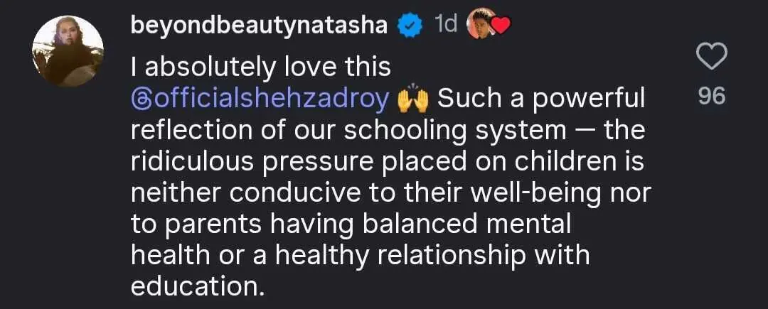 Natasha Ali Lakhani said the video was “such a powerful reflection of our schooling system” and the pressure placed on children, which is “neither conducive to their well-being, nor to parents having balanced mental health or a healthy relationship with education”.