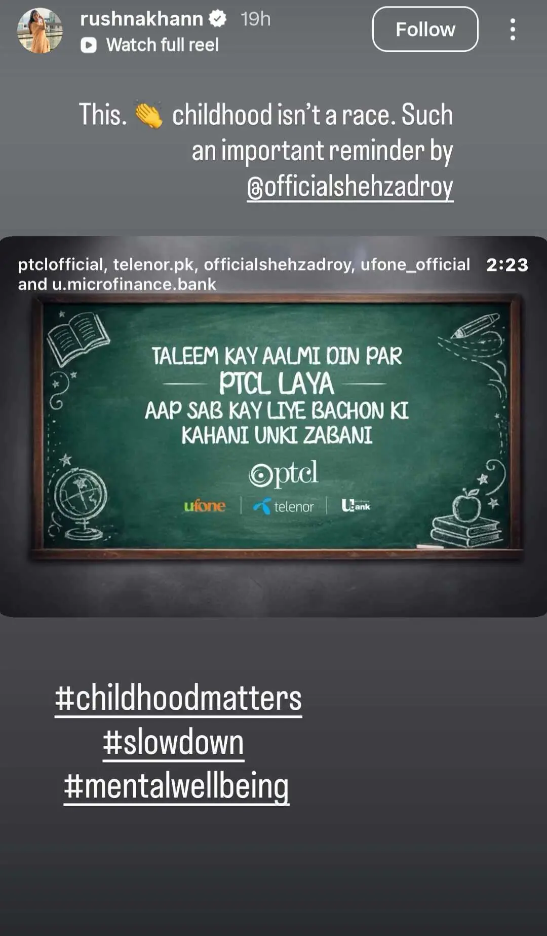 Rushna Khan who are actor from Case no 9 shared the song too, remarking that “childhood isn’t a race”.