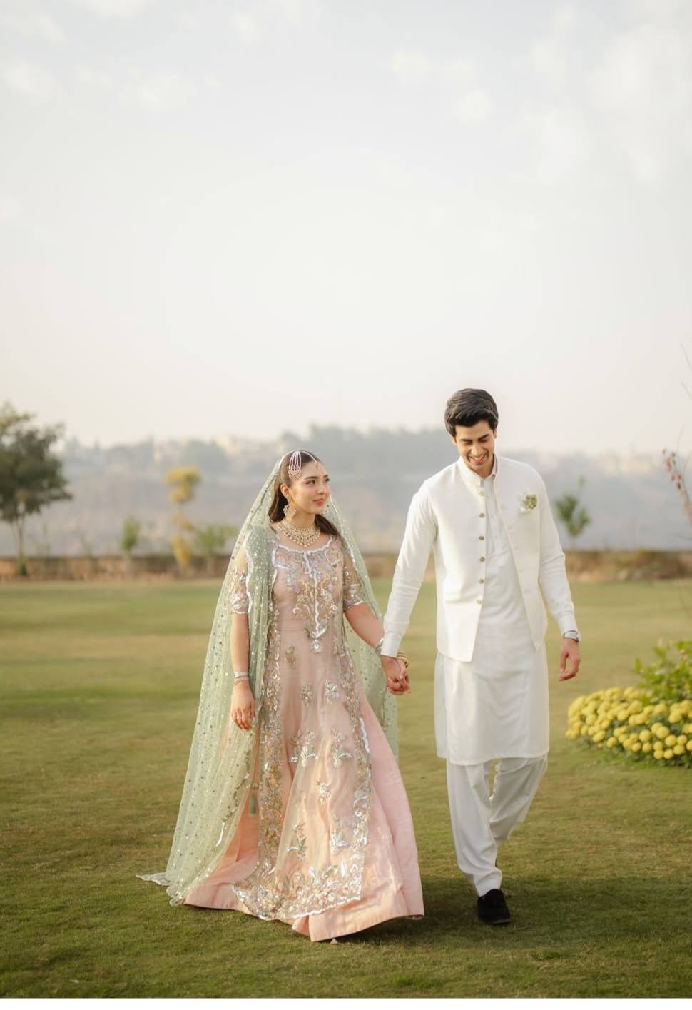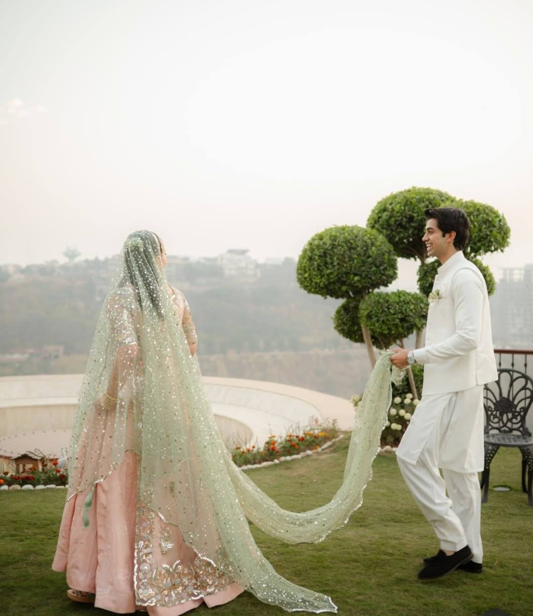 The newly surfaced pictures from the ceremony have quickly caught attention across social media platforms. Saniya Farukh looked radiant in a pastel green embellished outfit paired with traditional jewelry, while Ali complemented her look in a classic white traditional ensemble. Their candid moments, warm smiles, and natural chemistry reflected the happiness of the occasion.