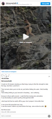 Speaking candidly about the experience, Fatima wrote, “It took me 20 minutes standing on that ledge, trying to find the strength to take the leap. And then i went for it.. That moment when you’re in the air, just before hitting the water.. feels horribly long. That sinking feeling in your stomach is haunting… and confusing. Because in those split seconds, I could feel fear turning into adrenaline. It was fascinating to watch myself go through that shift. Uske baad toh fear ka switch off ho gaya. And i jumped 4 time after that. It was never the jump that was scary. It was the stories i built in my head before the leap.. utna sochne ka nahi.. 😛 Bas khood jaao.”