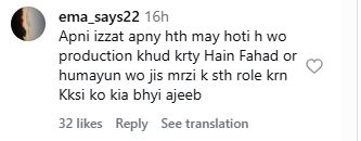 Some users taking a side of Fahad Mustafa and commented: “Apni izzat apny hth may hoti h wo production khud krty Hain Fahad or humayun wo jis mrzi k sth role krn Kksi ko kia bhyi ajeeb”