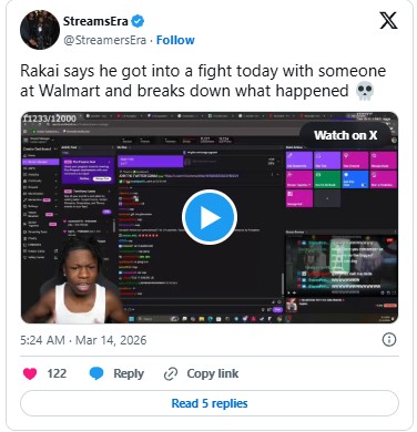Twitch streamer RaKai shared the details of a physical altercation outside a Walmart during a livestream, showing his viewers that his knuckles were injured in the incident. A 1-minute-28-second clip from the stream was later circulated on X on March 13, 2026.