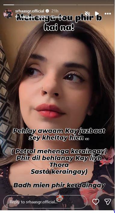 Actress Srha Asghar took to social media to highlight the impact of rising fuel prices, saying they make daily life harder and strain household budgets already burdened by inflation. She questioned why petrol rates keep climbing despite economic hardships and urged authorities to consider the public’s struggles, calling the situation unfair and frustrating for ordinary citizens.