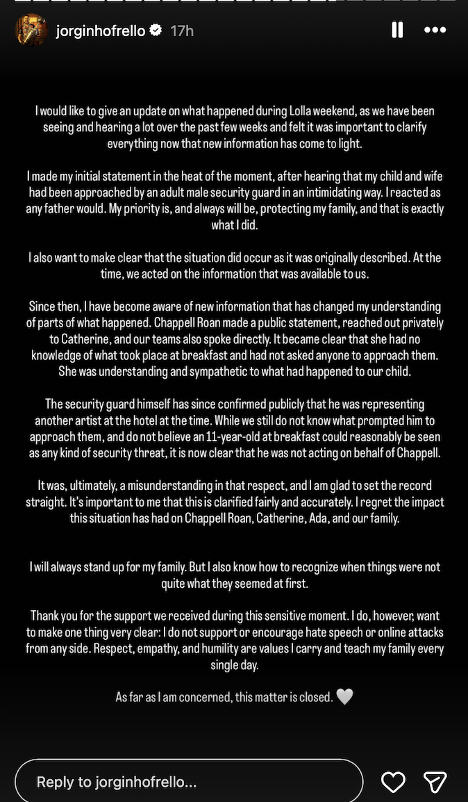 He also noted that Chappell Roan had no prior knowledge of the incident and did not instruct anyone to approach his family. Jorginho revealed that the singer later reached out privately, expressing understanding and concern regarding the situation.