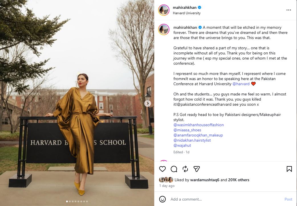 Mahira Khan, Pakistani superstar shared a proud and unforgettable experience, as representing Pakistani at the prestigious Pakistan Conference held at Harvard University in 2026, expressing it that she will always cherish this kind of moment.