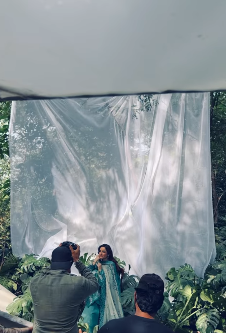 The post also included behind-the-scenes shots from a professional outdoor shoot. Yumna was seen in a teal traditional outfit surrounded by flowing fabrics and crew members. These candid glimpses highlighted her dedication to her craft while maintaining her signature elegance.