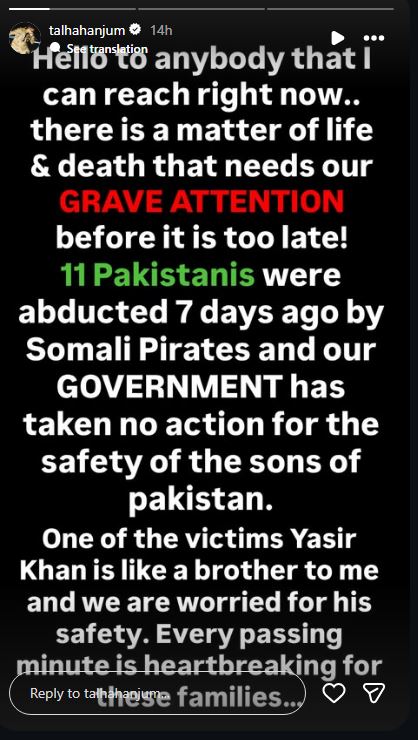 Rapper Talha Anjum has stated his concern over the captured of 11 Pakistanis by Somali pirates a week ago. He exposed that he personally knows one of the victims and urged the government to take immediate action to ensure their safe recovery, adding that the families of those abducted are going through immense trauma.