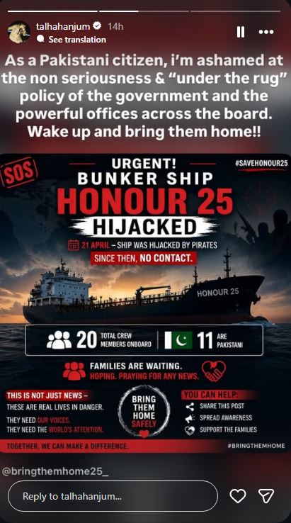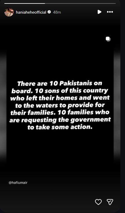 Hania Amir took her Instagram and shared a story and requesting government to take some action and wrote, ‘There are 10 Pakistanis on board. 10 sons of this country who left their homes and went to the waters to provide for their families. 10 families who are and requesting government to take some action’