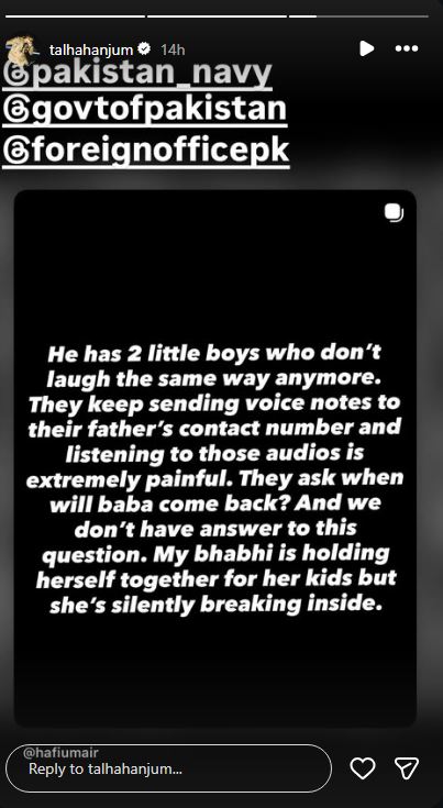 One of his stories, shared from the victim’s family member and tagged Pakistan Navy, Govt of Pakistan and Foreign office pk, In the status victim’s family member wrote, ‘he has two little boys who don’t laugh the same way anymore. They keep sending voice notes to their father’s contact number and listening to those voice audios is extremely painful. They ask when baba come back? And we don’t have answer to these questions. My Bhabhi is holding herself together for her kids but she’s silently breaking inside.’