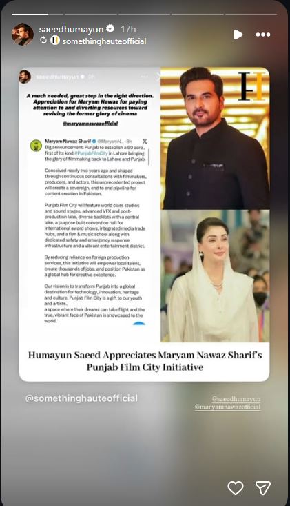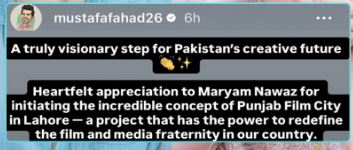He wrote on Instagram, “A truly visionary step for Pakistan’s creative futureHeartfelt appreciation to Maryam Nawaz for initiating the incredible concept of Punjab Film City in Lahore – a project that has the power to redefine the film and media fraternity in our country,”