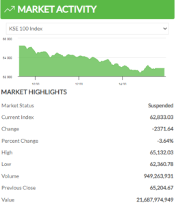 The Pakistan Stock Exchange (PSX) benchmark KSE-100 Index on Tuesday crashed falling over 2371 points. Stock market value reduced by 3.6% concluding at 62,833 points.