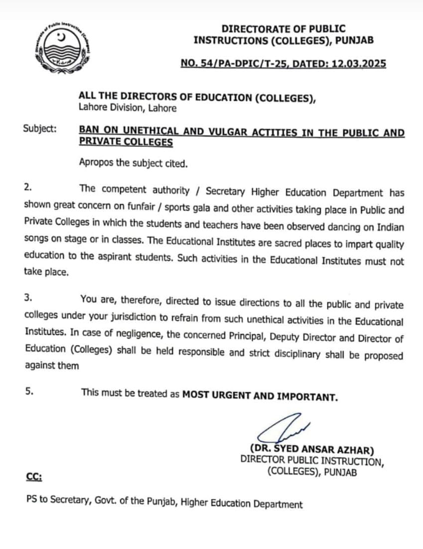 The Punjab Directorate of Public Instruction (Colleges) has officially banned dancing and other “unethical” activities in both public and private colleges across the province.