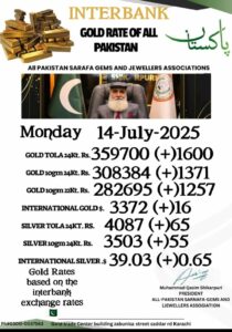 According to the All-Pakistan Gems and Jewelers Sarafa Association (APGJSA), the price of gold per tola rose by Rs1,600, reaching Rs359,700. The price of 10 grams of gold increased by Rs1,371, now standing at Rs308,384.