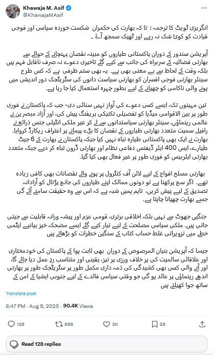 Khawaja Asif observed that no such claims had been made by India during the three months immediately following the incident, whereas Pakistan had promptly provided detailed technical briefings to international media. He noted that independent observers, global leaders, senior Indian politicians, and even foreign intelligence sources had acknowledged the significant losses suffered by India — including damages to Rafale jets and other military assets.