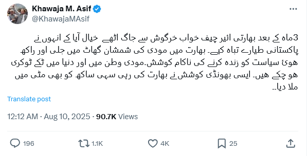 In a statement on social media platform X (formerly Twitter), Khawaja Asif remarked that the Indian Air Chief appeared to have woken up from a deep slumber after three months and only now remembered that they had allegedly destroyed Pakistani aircraft.