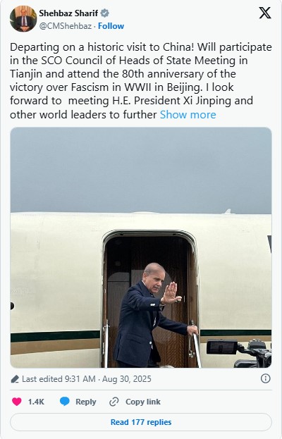 In a message shared on his official X account, the Prime Minister said he looks forward to meeting President Xi Jinping and other world leaders. He stressed that the visit is aimed at further strengthening Pakistan’s “All-Weather Strategic Cooperative Partnership” with China and enhancing regional cooperation, multilateralism, peace, and prosperity.