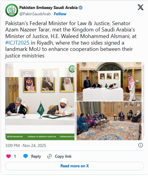 On the sidelines of the conference, Tarar conducted several high-level bilateral meetings. His primary engagement was with Saudi Justice Minister Waleed Mohammed Al-Samaani, during which Pakistan and Saudi Arabia signed a memorandum of understanding (MoU) aimed at deepening cooperation in judicial training, legal reforms, and technological development.