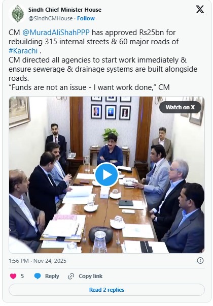During the briefing, Mayor Wahab confirmed that the estimated cost of the development projects stands at Rs25 billion. CM Murad Ali Shah assured that “funds are not an issue; what he needs is immediate and high-quality work for the public.”